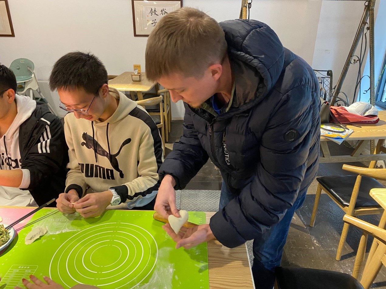 来自8个省市的10名植科学生相互切磋不同地方的包饺子技巧,现场欢声不断,外籍教师Kevin深受感染跃跃欲试,在同学的手把手示范下,顺利包出一个又一个饺子。期间,中外合作办学办公室主任刘志斋老师向外教和各位同学简要介绍了我国冬至南北习俗的差异,但饺子始终是中国人心中的最具代表性的冬至食物,是中国人美好记忆的重要元素。冬至将至,圣诞节也将至,对于离家万里的外籍教师们来说,该活动弥补了些许思乡之情。