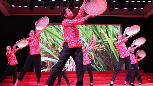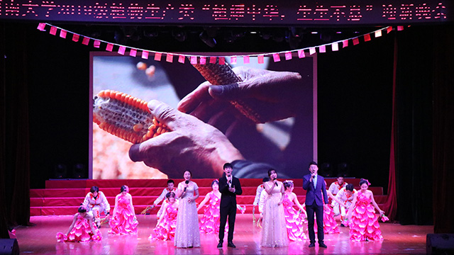 勤劳的姑娘们表演的舞蹈《晒谷子的姑娘们》为观众带来优美地视觉体验。晒谷子,是中国传统农耕文明中重要的一环,晒谷姑娘们一个个朝气蓬勃,脸上洋溢的是丰收的幸福,那一抹浅笑是丰收时秋天的味道;那一支稻穗是对农人衷心的祝福。影子戏《一生甘为一粒种》为我们生动地演绎了袁隆平学长无私奉献、无悔付出的一生;舞台剧《绿色梦想》展示了在梦想的路上的坚定与果敢;由师生共同演绎的诗朗诵《守正创新农业人》再一次升华了一代又一代农科人在研究的路上忠诚报国、一心向党。