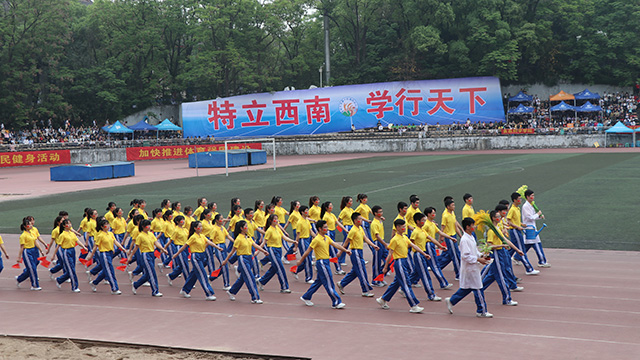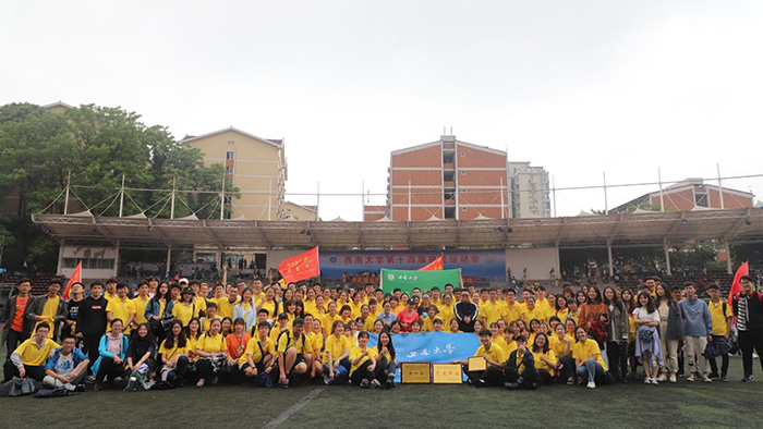 一张传遍朋友圈,登上西大官微的照片上,有一群小黄人挥舞着绿色的院旗,眼睛紧紧地盯住赛道的另一头,拿着喇叭,打着响鼓,燃动的鼓点声与呐喊声感染了在场的所有同学。