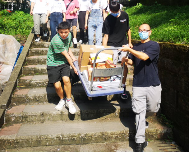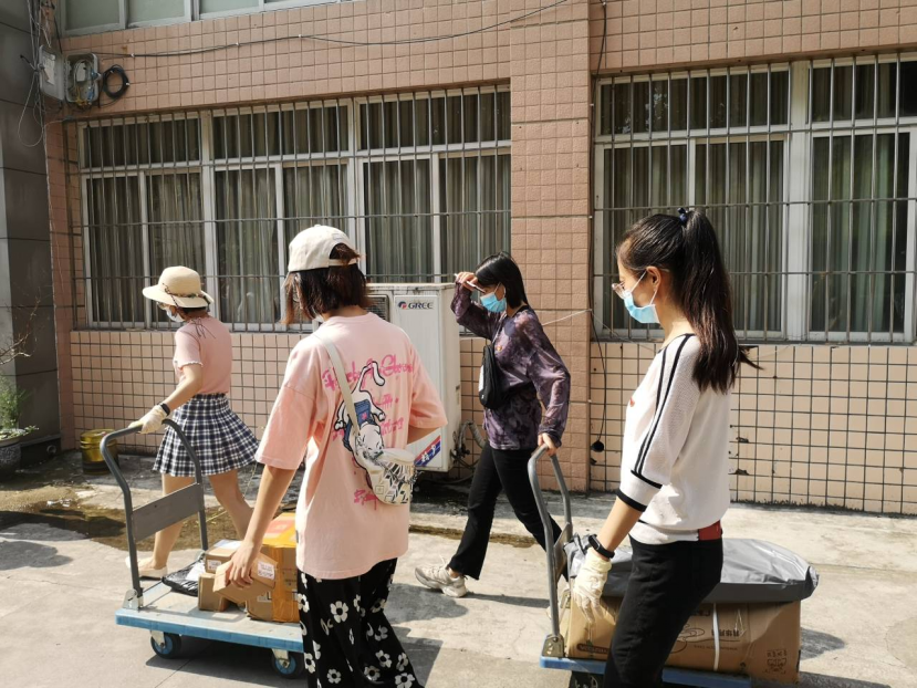 同时根据疫情常态化管理规定,为保障全校师生健康安全,家长无法陪同新生进入校园。学院全体学生党支部的同志们完了协助新同学完成行李搬运、快递领取和宿舍布置等任务。为了确保每一位新同学都能尽快适应新环境,“红砖”党员服务队提前统筹规划,实行“党支部与班级一对一”的策略,各支部分别对接新生班级,保证每个班级都有党支部对接直接服务。由于新生初入校园暂不能自由活动,红砖党员服务队的研究生党员孙双飞等同志使用手推车将新生们的行李快递包裹从快递点搬运至竹园宿舍楼下,方便新生收取日常生活用品,同时减少人员流动,保障校园安全。党员服务队志愿者周玥同志说:“每个党员都是一面旗帜,发挥带头作用,以党员身份力所能及为同学们提供帮助,是我们的光荣”。