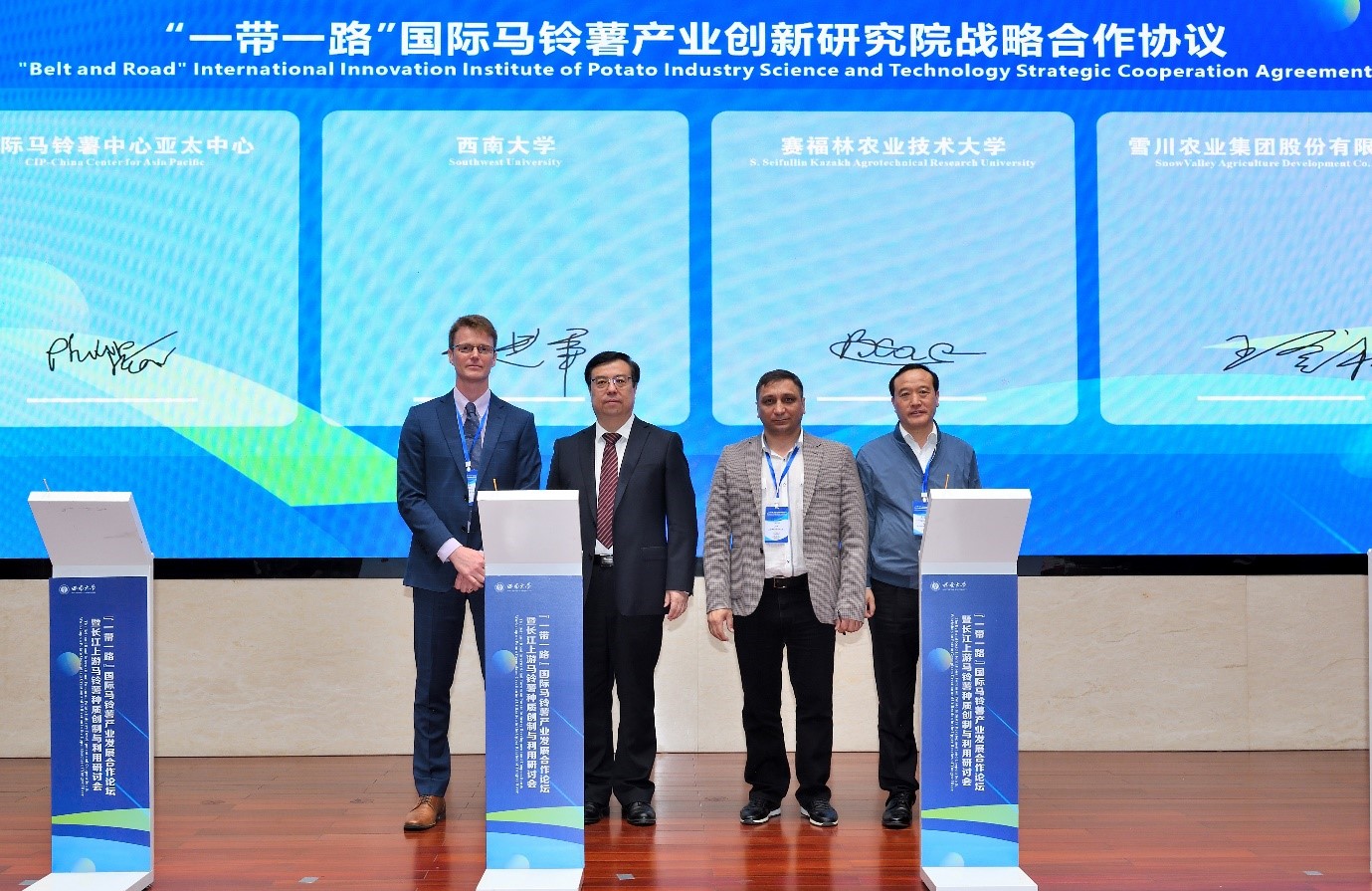 党委常委、副校长王进军、农业农村部人力资源开发中心副处长李厥桐等出席仪式并致辞,王进军、中国种子协会马铃薯分会会长王登社、国际马铃薯中心亚太中心国家联络科学家Philip James Kear博士、哈萨克斯坦塞弗林农业科技大学Vadim Khassanov教授代表各方签署合作协议;国家马铃薯产业体系首席科学家金黎平研究员、国际马铃薯中心育种部主任Hannele Lindqvist-Kreuze博士等人进行了倡议书发布。重庆市农业农村委员会二级巡视员周敏、中国科学技术交流中心欧亚处负责人万聪、中国西部(重庆)科学城种质创制大科学中心首席科学家夏庆友教授、中国种子协会原副会长兼秘书长李立秋等出席见证。