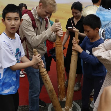 吕典秋院长致辞,号召大家以节为媒,释放情感,传承文化,寻找归属,助力乡村振兴!接着,全体师生们一起体验了传统打糍粑活动,蒸好的糯米迅速放入石槽,被硕大的木杵一下一下地舂至绵软柔韧,新鲜软润的面团就成形了。“原来糍粑是这样制作出来的,以前从未亲手做过。”参加活动的同学们惊喜地说道。