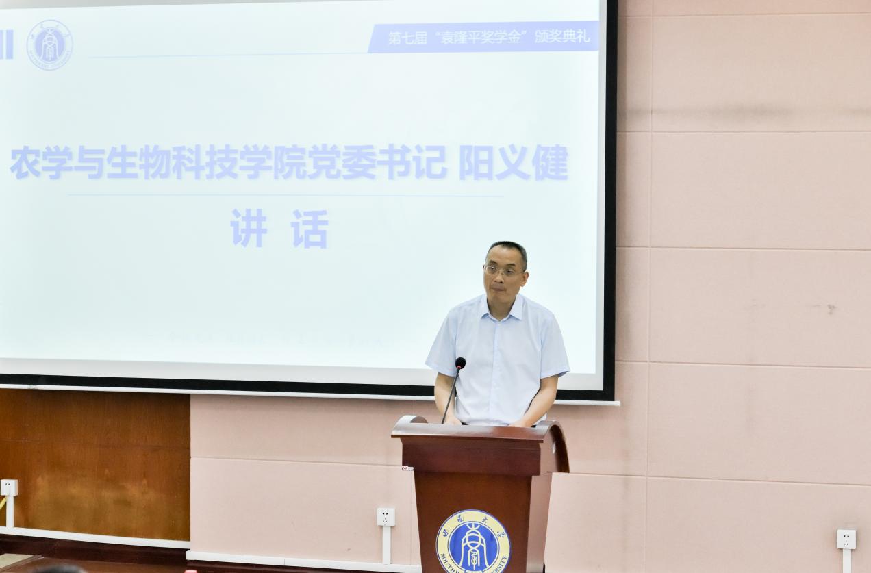 学院党委书记阳义健在讲话中指出,奖学金设立至今已开展七届评选,共65名学子获此殊荣,2024年学院李加纳教授更以个人薪资捐资20万元,助力袁隆平精神传承延续。他向在场的同学们提出三点希望:一是立大志、担大任,主动把握生物育种、智慧农业等科技前沿方向,在乡村振兴的时代征程中勇挑重担,争做农业科技创新的主力军;二是下苦功、练本领,充分依托科研实验室、各级创新竞赛等平台,夯实专业基础、提升创新素养,在实践淬炼中拓宽知识视野;三是接地气、干实事,牢记“把论文写在大地上”的谆谆教诲,主动走进田间地头,在试验田中找答案、在泥土里积累经验,将理论知识转化为服务“三农”的真才实学。讲话最后,阳义健书记号召广大青年学子以袁隆平精神为指引,把个人理想融入国家发展大局,在农业现代化建设中挥洒青春汗水,为实现“禾下乘凉梦”“杂交水稻覆盖全球梦”贡献青春力量。