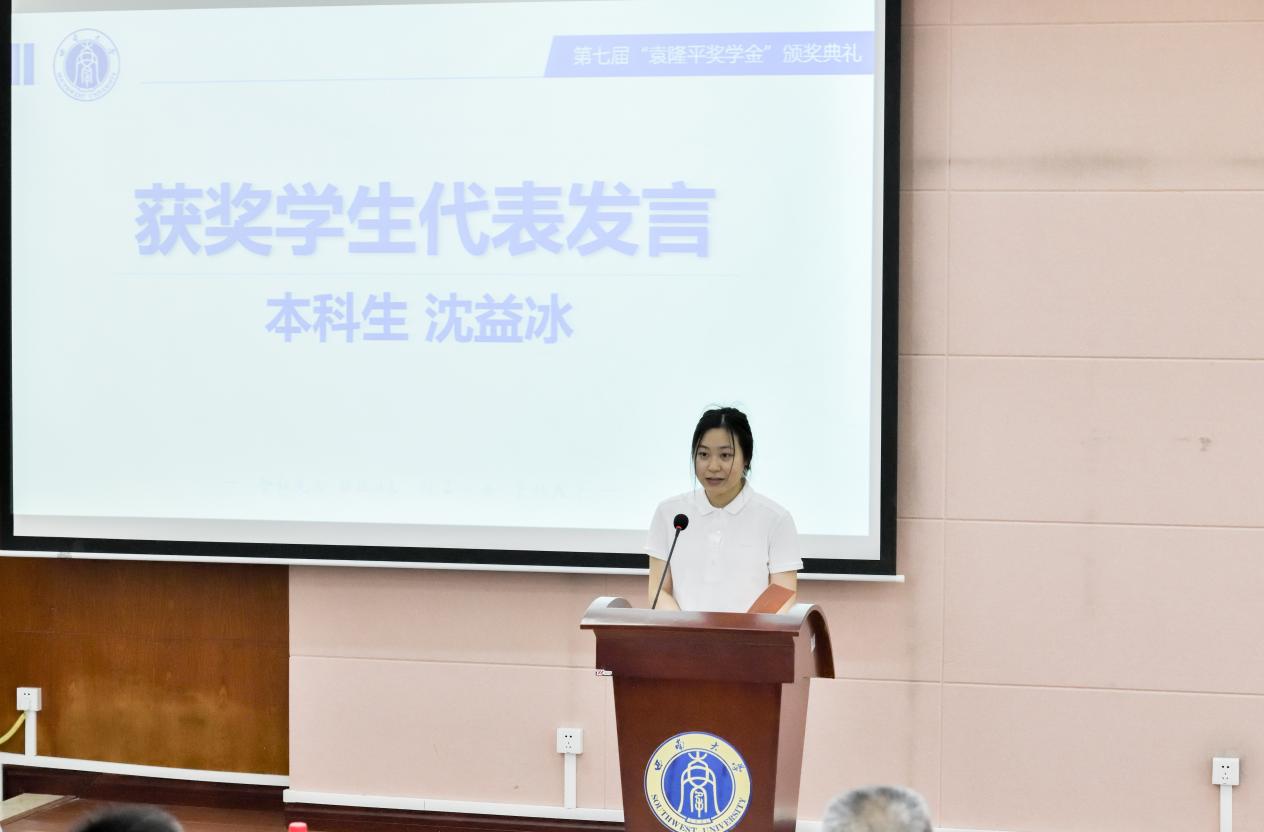 获奖学生代表沈益冰上台发言。作为隆平实验班的学生,她分享了自己的求学经历。因高中生物课本上袁隆平院士“山外青山楼外楼,自然探秘永无休”这句话,她对农业科学产生浓厚兴趣,并坚定选择农学专业。大学期间,面对繁重课业,袁院士的精神一直激励着她。她凭借坚持不懈的努力,连续多年保持专业第一,构建起扎实的知识体系。同时,通过学院搭建的科研训练平台,让她不断提升了科研实践能力。沈益冰的发言,展现了新时代农科学子对袁隆平精神的践行与传承。