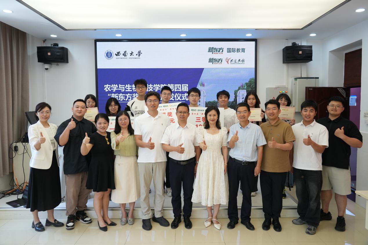 顺利举办第四届“新东方奖学金”颁发仪式。出席仪式的有重庆新东方国际教育总经理杨笑天,北京新东方前途出国重庆分公司总经理韦晓丽,学院院长吕典秋、副书记刘秋艳、副院长张建奎以及2022级辅导员、植科专业转校区学生。2022级辅导员白祯主持仪式。