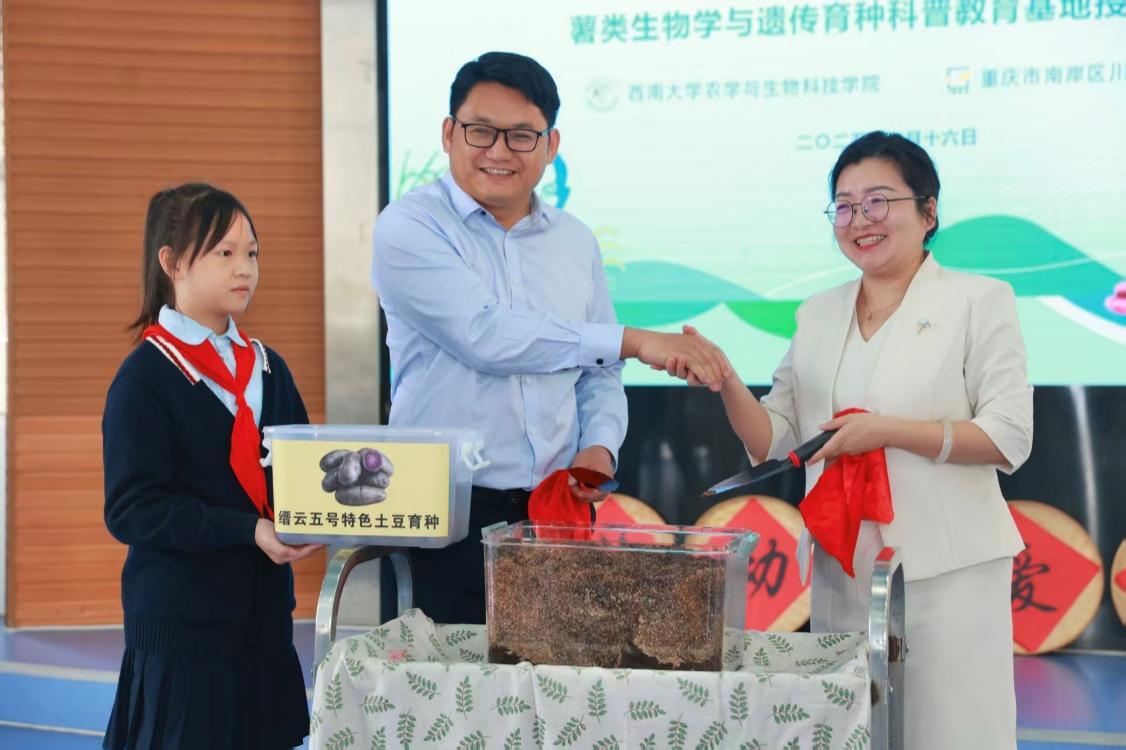 为深入贯彻落实国家关于全面加强新时代大中小学劳动教育的精神,推动“双减”政策走实走深,2025年10月16日,学院与川益小学联合举办的以“耕读传家,薪火相传”主题的秋耕实践暨薯类生物学与遗传育种科普教育基地授牌仪式在南岸区川益小学举行。学院博士生导师、重庆市薯类生物学与遗传育种重庆市重点实验室副主任、重庆市农业农村委现代农业产业技术体系薯类创新团队岗位科学家刘勋教授,蒋锐博士,御姐av
