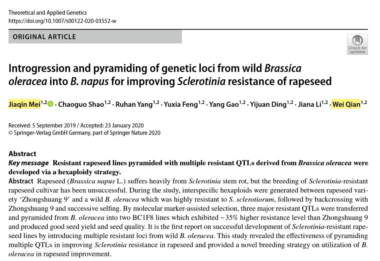 3、梅家琴教授以第一作者身份在农林领域权威期刊Theoretical and Applied Genetics(5-year Impact Factor为3.996)上发表论文《Introgression and pyramiding of genetic loci from wild Brassica oleracea into B. napus for improving Sclerotinia resistance of rapeseed》。研究首次利用野生甘蓝的多个菌核病抗性位点成功培育油菜菌核病抗性系。研究揭示了聚合多重QTL在提高油菜菌核抗性方面的有效性,为利用甘蓝改良油菜提供了一种新的育种策略。钱伟教授为论文通讯作者,御姐av
