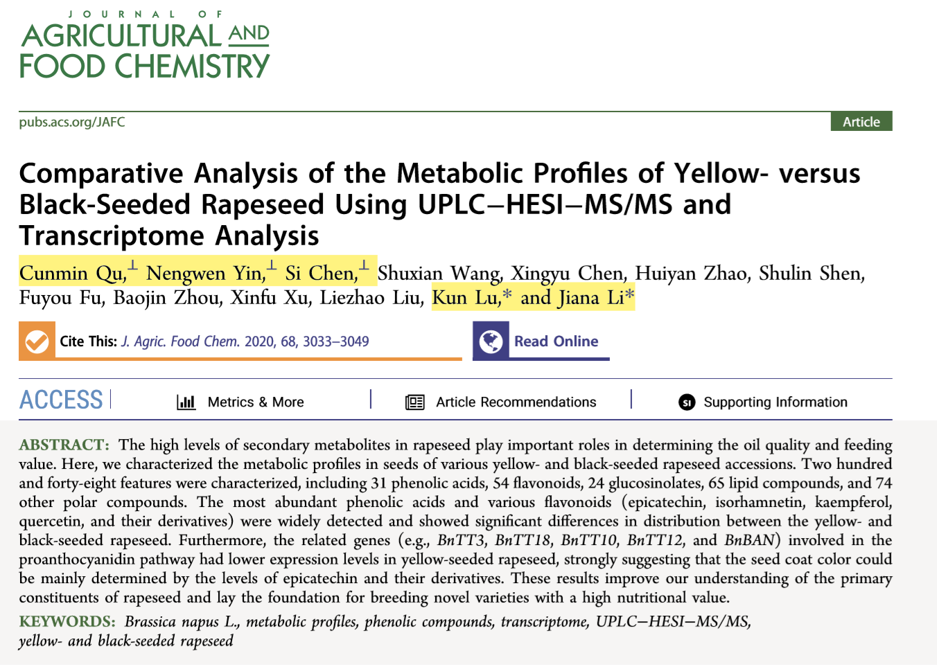 2、曲存民副教授以第一作者身份在农林领域权威期刊Journal of Agricultural and Food Chemistry(5-year Impact Factor为3.911)上发表论文《Comparative Analysis of the Metabolic Profiles of Yellow- versus Black-Seeded Rapeseed Using UPLC−HESI−MS/MS and Transcriptome Analysis》。研究鉴定了黑籽和黄籽油菜248种代谢组分,发现原花青素途径的相关基因在黄籽油菜籽中表达水平较低,说明籽粒颜色主要由表儿茶素及其衍生物的水平决定。结果为培育营养价值高的新品种奠定了基础。卢坤教授和李加纳教授为论文的共同通讯作者,御姐av