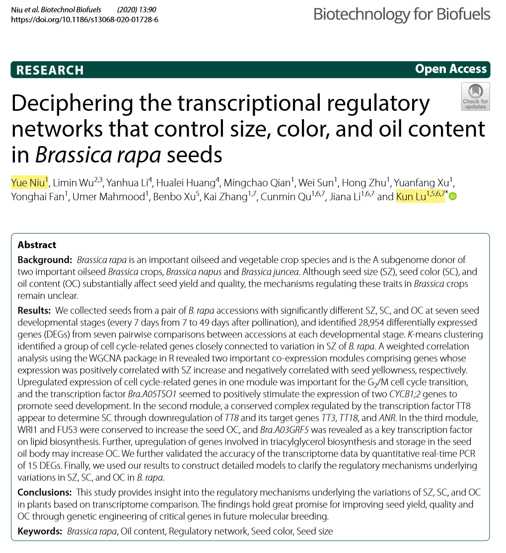 1、硕士生牛越以第一作者身份在生物能源领域权威期刊Biotechnology for Biofuels(5-year Impact Factor为6.343)发表论文《Deciphering the transcriptional regulatory networks that control size, color, and oil content in Brassica rapa seeds》。研究构建了控制白菜型油菜种子大小、种子颜色和含油量的转录调控网络,发现转录因子Bra.A05TSO1通过细胞周期途径控制种子大小;转录因子TT8靶向TT3、TT18和ANR控制种子颜色;Bra.A03GRF5为脂肪酸合成的关键转录因子。研究为通过基因工程育种提高油菜产量和品质奠定了基础。卢坤教授为论文通讯作者。研究受到国家重点研发计划,国家自然科学基金,111项目,重庆市自然科学基金和重庆农业发展基金项目资助。