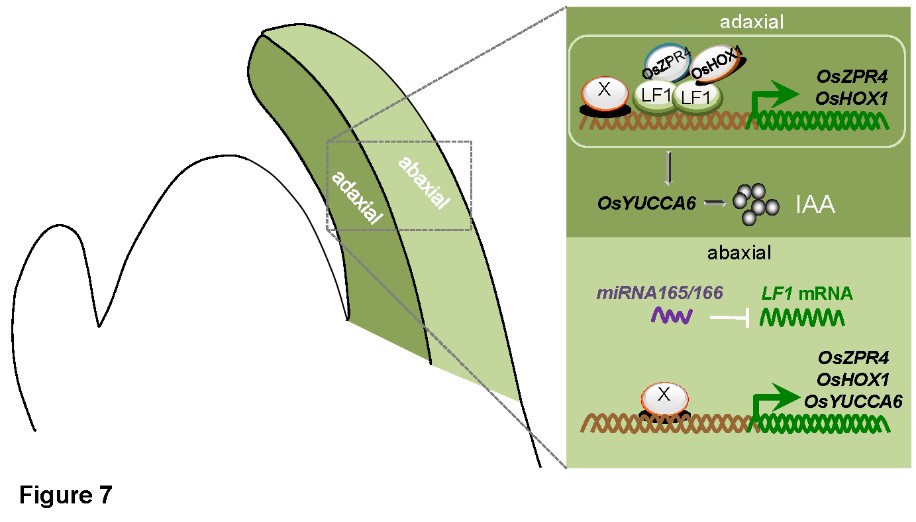 在先前的研究中,该团队鉴定了一个水稻显性突变体,lateral floret 1 (lf1),LF1编码HD-ZIP III转录因子,调控水稻“三花小穗”的发育,该研究一方面证实了“三花小穗”假说,同时也为水稻高产育种提供一条新的思路(Zhang et al., 2017),研究结果发表在国际知名期刊《PNAS》。在本研究中,lf1表现出侧生器官极性发育缺陷的表型。LF1在侧生器官中的表达受到miRNA165/166的限制,从而特异在近轴面表达。LF1可直接激活小亮氨酸拉链家族基因OsZPR4和HD-ZIP II家族基因OsHOX1的表达,OsZPR4和OsHOX1分别与LF1相互作用形成异源二聚体抑制LF1的转录活性。LF1通过直接调节OsYUCCA6的表达影响吲哚-3-乙酸(IAA)的含量。综上所述,LF1与OsZPR4和OsHOX1形成负反馈调节环,通过影响IAA含量,从而调控水稻侧生器官极性发育。研究结果为侧生器官极性发育的分子机制提供了新的见解。