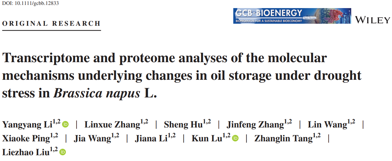 博士生李阳阳在《GCB-Bioenergy》(IF2020 = 5.316)上发表题为《Transcriptome and proteome analyses of the molecular mechanisms underlying changes in oil storage under drought stress in Brassica napus L.》的论文,揭示了干旱胁迫导致种子发育过程中含油量降低,蛋白质含量增加;脂肪酸生物合成过程中基因和蛋白质表达降低,而脂肪酸降解和蛋白质储存过程中基因和蛋白质表达增加。干旱胁迫下增加GA含量可促进GDSL基因表达,导致脂肪酸含量的降低。长期干旱胁迫后籽粒中ABA合成增加和信号转导增强可能与籽粒含油量的变化有关。研究结果揭示了干旱胁迫下甘蓝型油菜种子含油量下降的分子机制,为甘蓝型油菜新品种的选育提供了理论依据。