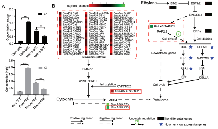 博士生钱明超在《Journal of Experimental Botany》(IF2020 = 5.908)上发表题为《Genome-wide association study and transcriptome comparison reveal novel QTL and candidate genes that control petal size in rapeseed》的研究论文,揭示了两种可能决定油菜花瓣大小的调控通路: BnaA05.RAP2.2可能通过乙烯信号途径抑制细胞周期相关基因表达,导致花瓣变小;细胞分裂素信号转导途径的ARR4通过调节细胞周期相关基因促进花瓣变大。研究为理解植物花瓣发育的分子遗传机制奠定了基础。