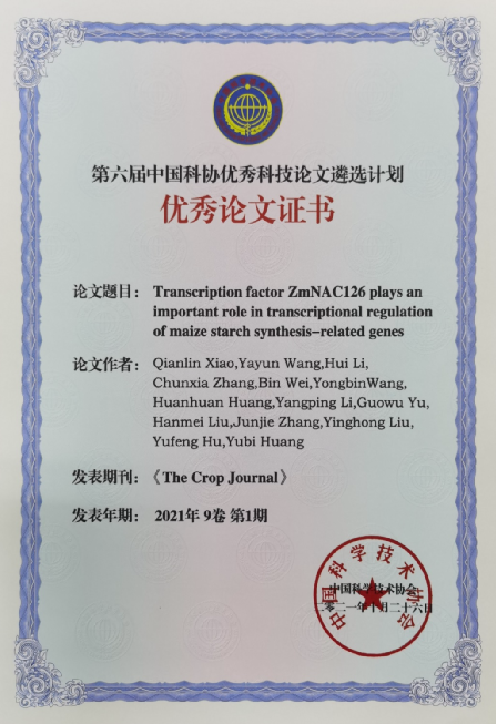 肖前林博士发表于Crop Journal(2021, 9: 192-203)的一篇题名为“Transcription factor ZmNAC126 plays an important role in transcriptional regulation of maize starch synthesis-related genes”的论文,成功获评中国科协优秀科技论文遴选计划农林集群“特等奖”,暨第六届中国科协优秀科技论文。