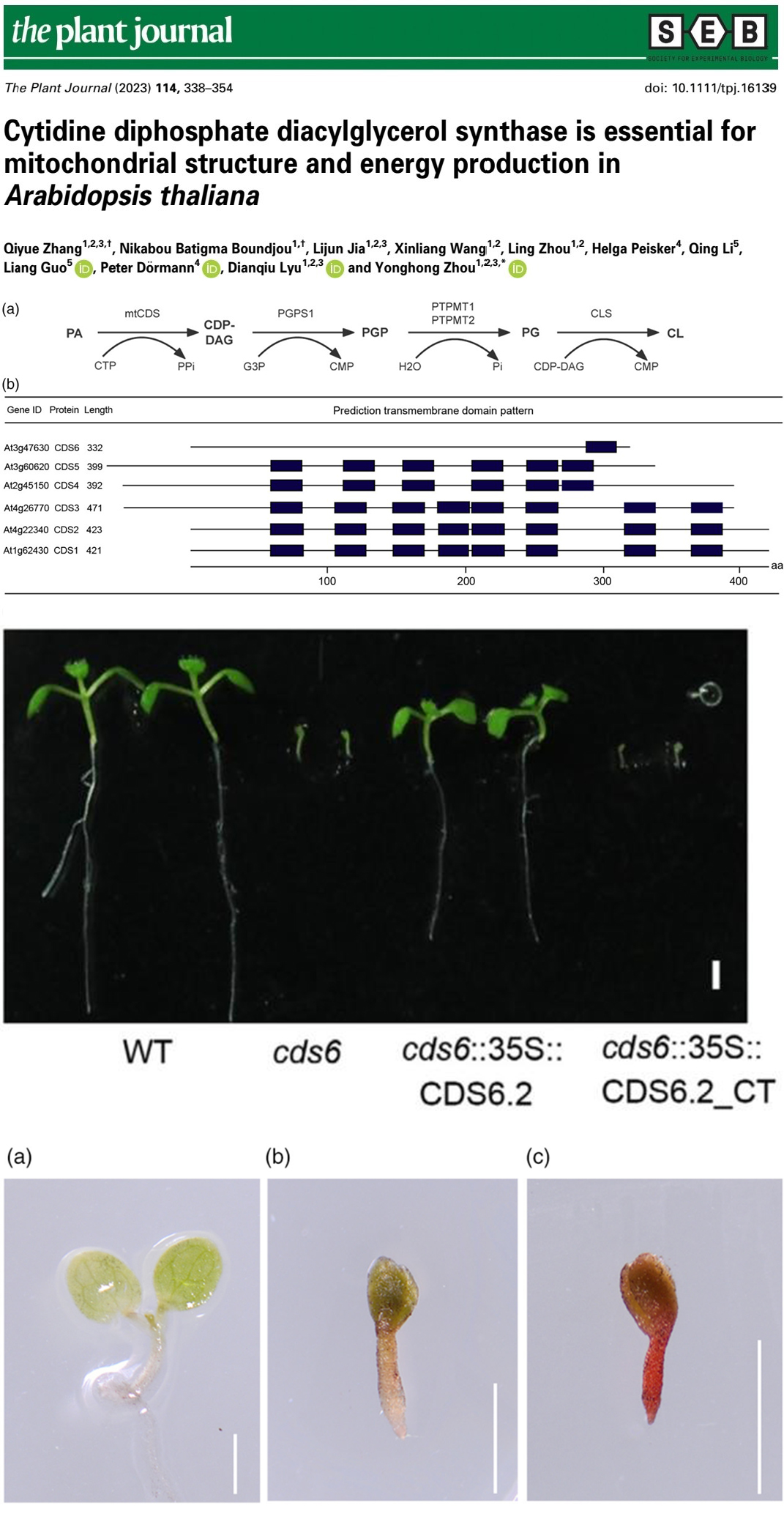 胞苷二磷酸二酰基甘油(CDP-DAG)是原核生物和真核生物中甘油磷酸脂生物合成的重要中间体。在不同细胞器中,CDP-DAG合酶(CDS)可催化合成特定的阴性磷酸甘油脂。前人的研究表明拟南芥CDS是膜内在蛋白,由一个小家族基因(被命名为CDS1-CDS5)编码。其中,CDS1、CDS2和CDS3位于内质网,CDS4和CDS5位于质体。然而,线粒体作为另一个脂质合成的场所,它所需的CDP-DAG的生物合成仍有待研究。该研究鉴定了一个线粒体特异性CDS蛋白,并命名为CDS6,进一步研究发现CDS6对于PG和CL在线粒体中的生物合成是必不可少的,这对线粒体内膜结构建成、TAG降解、能量代谢和幼苗发育至关重要。该研究以“Cytidine diphosphate diacylglycerol synthase is essential for mitochondrial structure and energy production in Arabidopsis thaliana”为题近期发表在生物学一区杂志《The Plant Journal》上,IF2022=7.091。2019级植物科学与技术专业本科生张琦玥为本文的第一作者,已毕业国际硕士研究生Nikabou Batigma Boundjou为共同第一作者,指导老师周永洪副教授为通讯作者。该论文受到了国家重点研发计划项目(2018YFE0127900)、中央高校基本科研业务费专项资金(SWU118109)、科技部科技合作计划项目(KY201904016)、御姐av