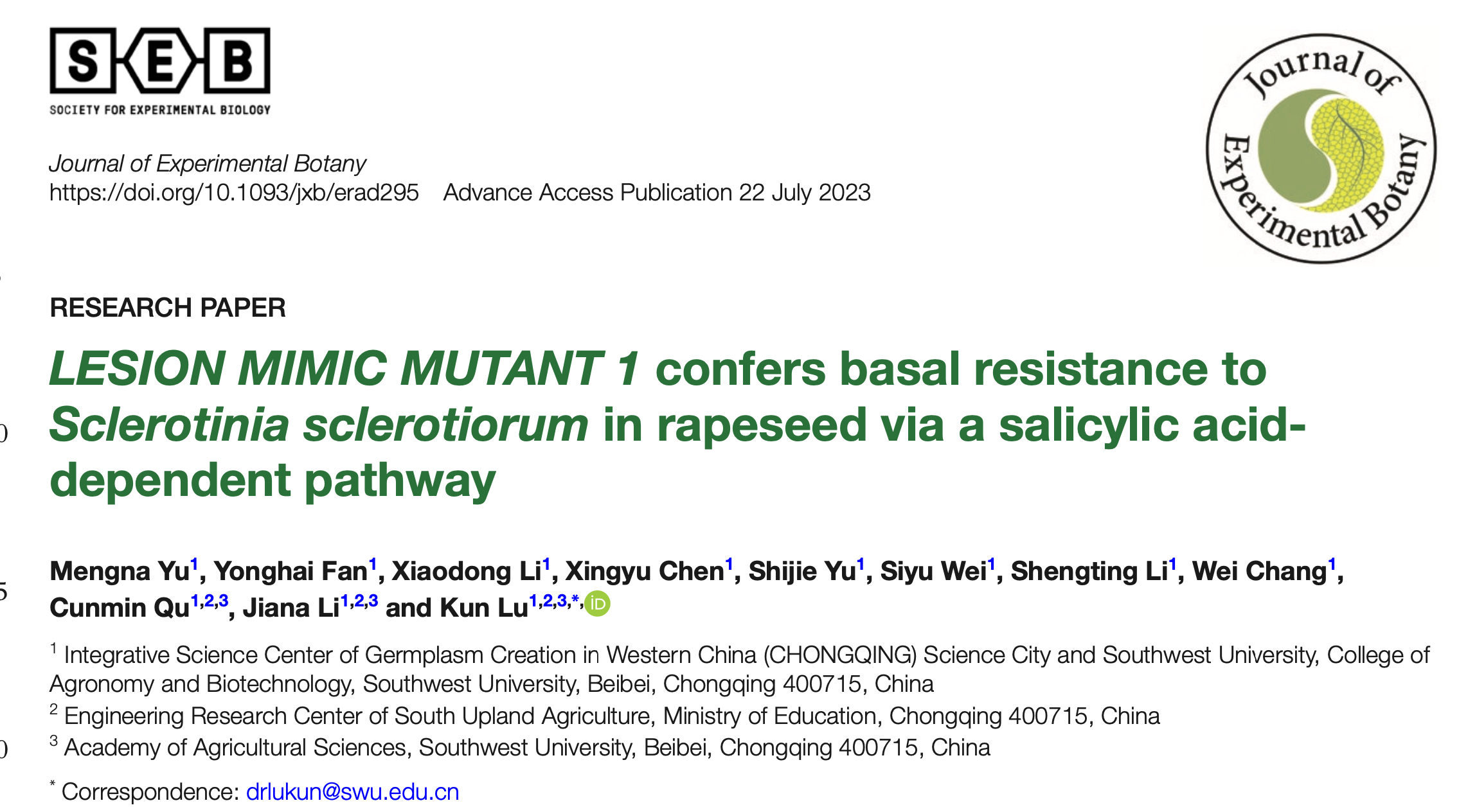 油菜分子育种团队近期在Journal of Experimental Botany(IF2023 = 6.9)发表题为LESION MIMIC MUTANT 1 confers basal resistance to Sclerotinia sclerotiorum in rapeseed via a salicylic acid-dependent pathway的研究论文,试图通过类病斑突变体lmm1为内源性激素水杨酸(SA)介导油菜核盘菌抗性提供新的见解,同时为油菜及近缘物种的抗病品种的选育奠定理论基础。