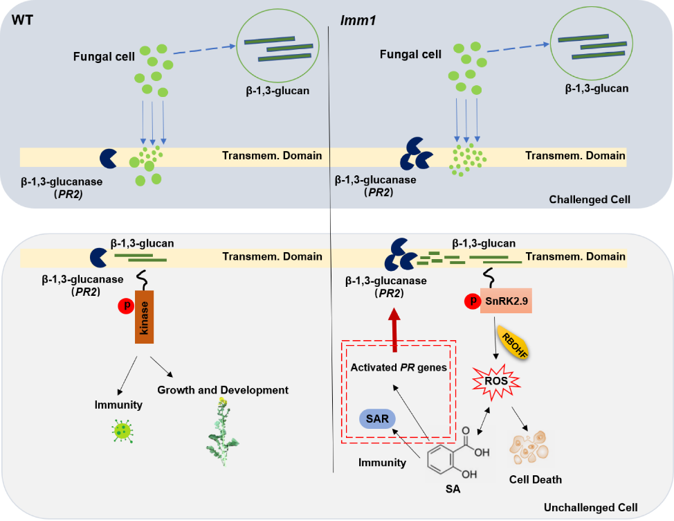 本研究从油菜自交系中双11的EMS诱变群体中,鉴定了一个抗核盘菌且稳定遗传的光依赖型类病斑突变体lmm1。研究发现,lmm1表型由隐性单基因控制,基于BSA的QTL-seq混池重测序分析,基因定位于C04染色体2.71 Mb的区间范围内,在甘蓝型油菜基因组上共包含176个候选基因。田间观察发现,lmm1在抽薹期由叶片开始呈现类病斑表型且光合系统紊乱,成熟期植株生长发育受严重影响,株型表现为矮小紧凑,生物量和经济产量显著下降。与此同时,组织化学染色及抗氧化酶活的结果表明,H2O2在类病斑发生区周过度积累且细胞出现程序性死亡。比较转录组学发现,在ZS11与lmm1中共有877个差异表达基因,其中188个与防御反应相关的基因中包含95个系统获得抗性的功能基因,这与lmm1叶片中较高的SA水平一致。结合BSA重测序和转录组结果初步确定一个编码BGL2(β-1,3-葡聚糖酶2)蛋白的BnaC4.PR2作为候选基因,并提出BnaC4.PR2的过表达可能诱导植株活性氧爆发,导致组织细胞死亡和系统获得抗性的激活,进而增强lmm1的核盘菌抗性的分子机制。