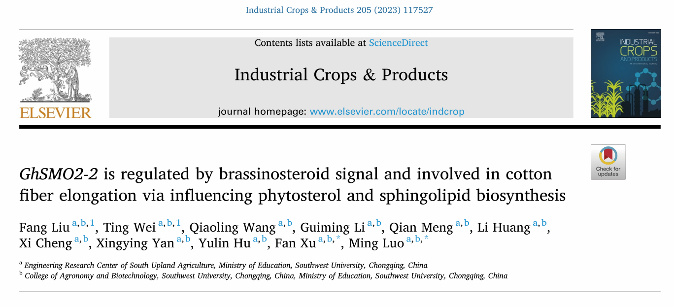 罗明教授团队在Industrial Crops and Products(IF2022=5.9)发表了题为《GhSMO2-2 is regulated by brassinosteroid signal and involved in cotton fiber elongation via influencing phytosterol and sphingolipid biosynthesis》的研究论文,揭示了受油菜素内酯调控的固醇合成酶基因GhSMO2-2通过影响植物固醇和鞘脂的合成影响棉花纤维发育的分子机制。