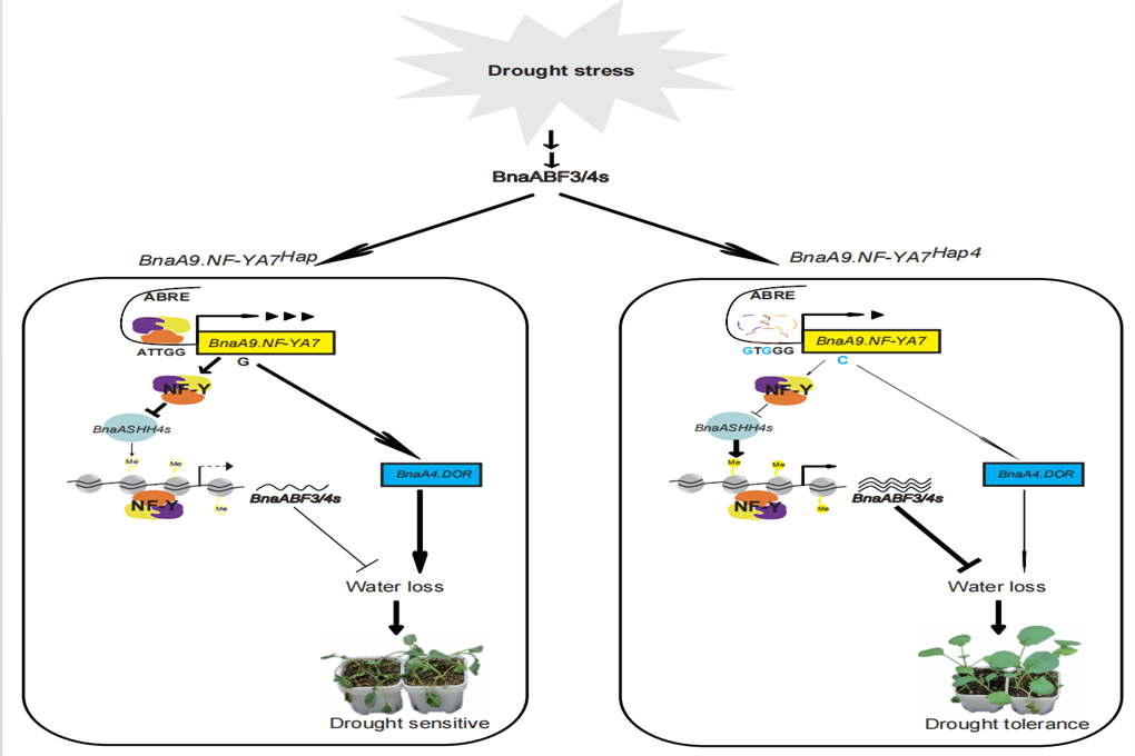 油菜工程技术研究中心在Nature Communications发表了题为Natural variation in BnaA9.NF-YA7 contributes to drought tolerance in Brassica napus L.的研究论文,该研究通过关联分析发现BnaA9.NF-YA7的自然变异与甘蓝型油菜的耐旱性有关,围绕BnaA9.NF-YA7介导的遗传调控机制开展系列研究,成功解析了BnaA9.NF-YA7作为ABA信号平衡的补充因子参与甘蓝型油菜干旱胁迫响应的分子机制,为油菜耐旱品种改良提供了新的分子策略。
