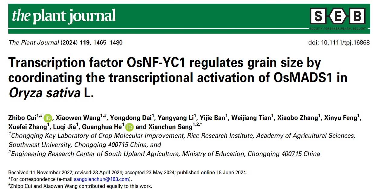 1)Cui ZB#, Wang XW#, Feng XY, Li YY, Dai YD, Ban YJ, Tian WJ, Zhang XB, Zhang XF, Jia LQ, He GH, Sang XC*. Transcription factor OsNF-YC1 regulates seed growth by coordinating the transcriptional activation of OsMADS1 in Oryza sativa L. The Plant Journal, 2024, 119, 1465-1480.