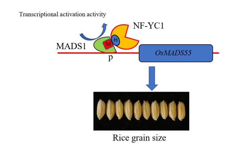 本研究中,该团队利用CRISPR-Cas9技术敲除了OsNF-YC基因家族,发现OsNF-YC1基因功能缺失后籽粒变窄,粒宽和粒厚减小,粒重降低,穗粒数增多,单株产量无明显变化。RNAi转基因株系也表现类似的籽粒表型。细胞学观察表明颖壳细胞变小和数量减少是导致osnf-yc1籽粒变窄的主要原因。酵母文库筛选获得了一个与OsNF-YC1相互作用的蛋白OsMADS1,该互作得到了双分子荧光素酶互补BIFC和Pull-down实验的进一步确定。进一步研究发现,OsNF-YC1特异调控OsMADS1的转录激活活性,从而协同调控下游靶基因OsMADS55等的表达。在osnf-yc1突变体中超表达OsMADS55基因,转基因植株的籽粒宽和籽粒厚得到部分回复。以上结果表明证实了OsNF-YC1-OsMADS1-OsMADS55通路在水稻籽粒发育中的功能和作用机理,为利用水稻生物育种提供了基因资源和育种策略。