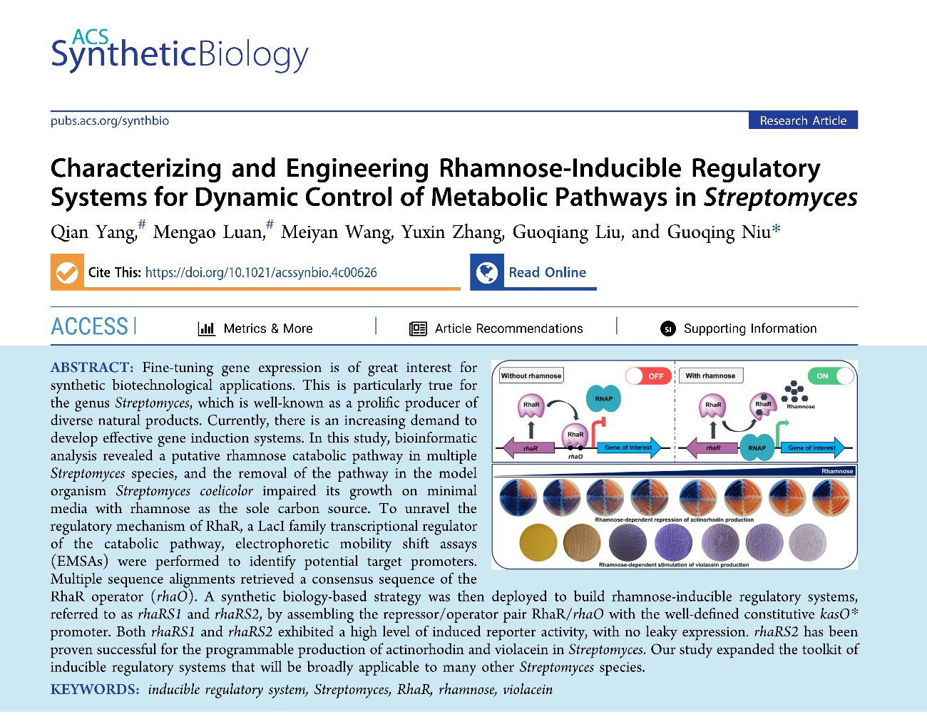 近日,牛国清研究员团队利用模块化设计理念组装了一套新型鼠李糖诱导表达系统,成功应用于链霉菌基因表达的精确调控,并实现了放线紫红素和紫色杆菌素的可编程合成,相关成果以“Characterizing and Engineering Rhamnose-Inducible Regulatory Systems for Dynamic Control of Metabolic Pathways in Streptomyces”为题发表于《美国化学学会·合成生物学》(ACS Synthetic Biology)。2022级硕士研究生杨倩和栾孟澳为共同第一作者,博士研究生王美燕和张雨欣以及神农班本科生刘国强参与了部分工作,牛国清研究员为通讯作者。