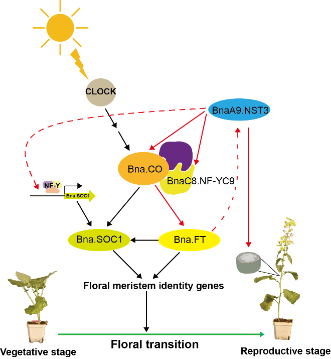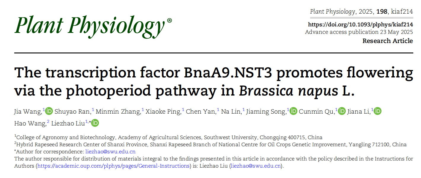 油菜团队在Plant Physiology上发表了题为“The transcription factor BnaA9.NST3 promotes flowering via the photoperiod pathway in Brassica napus L.”的研究论文,解析了植物次生细胞壁合成的关键调控因子NST3通过光周期途径调控甘蓝型油菜开花的新机制。