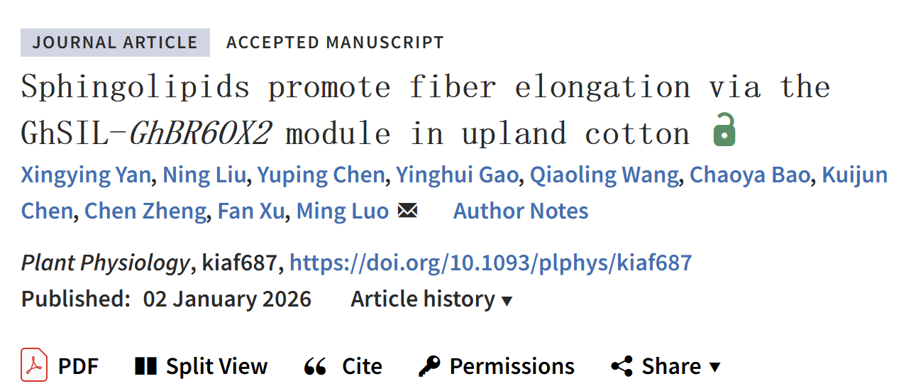 罗明课题组在植物学权威期刊Plant Physiology上发表题为Sphingolipids promote fiber elongation via the GhSIL-GhBR6OX2 module in upland cotton的研究论文,揭示了鞘脂信号通过GhSIL-GhBR6OX2模块调控纤维细胞伸长,揭示了鞘脂调控植物生长发育分子机制中的一个新节点。