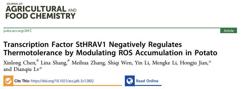 吕典秋课题组在国际期刊《Journal of Agricultural and Food Chemistry》上发表题为Transcription Factor StHRAV1 Negatively Regulates Thermotolerance by Modulating ROS Accumulation in Potato的研究论文。该研究鉴定了一个新的RAV家族转录因子StHRAV1,系统解析其通过调控活性氧(ROS)稳态负向调控马铃薯耐热性的分子机制,为作物耐高温分子育种提供了新思路。