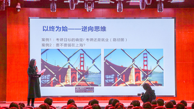 讲座伊始,田老师以具体的问卷调查数据和演员李冰冰获奖等典型案例向同学们深入阐述了求职提前做好准备的重要性,及早思考职业规划,方能赢得掌握未来的主动权。除此之外,田老师带同学们进行了一场“穿越时空”的想象体验。在舒缓的伴奏声中,同学们闭上双眼,十年后、五年后、三年后、一年后……未来的职业蓝图在同学们的脑海中徐徐展开,转换思维,步步倒推,奋斗路径逐渐明晰。紧接着,田老师向同学们介绍了“以终为始——逆向思维”的思考方法:当你在人生的迷宫中感到迷茫之时,不妨从出口向内走,转换视角即可豁然开朗、柳暗花明。同样的两张图,聚焦的远近不同,看到的风景也就不同。无论是考研还是找工作,切忌好高骛远,选择适合自己的才是王道。坚定地眺望远方,就不会被眼前的障碍所迷惑。在此基础上,针对“考研还是就业”、“如何合理建立考研目标”等问题,田老师进行了细致入微的讲解,向同学们展示了“大学生就业七大渠道”,同时给出了许多宝贵的建议。讲座中,田老师提出了“绽放优势 把握核心竞争力”的观点:唯有抓住自身优势,提高个人价值的不可替代性,形成能力壁垒,方能决胜于职场。与此同时,紧扣个人特点,“不换行业换岗位”也不失为一个很好的选择。只有向世界展示出自己的个人才华,方能主宰自己的人生,否则,便很有可能被强者安排人生,随波逐流。那么,如何才能提高个人价值呢?“短时间内多付出,方能迎来快速成长。”田老师说道。她以“10000小时的刻意练习”为例,结合了诸多学长学姐的成长经历,旁征博引,向同学们提供了许多锻炼能力的好方法。