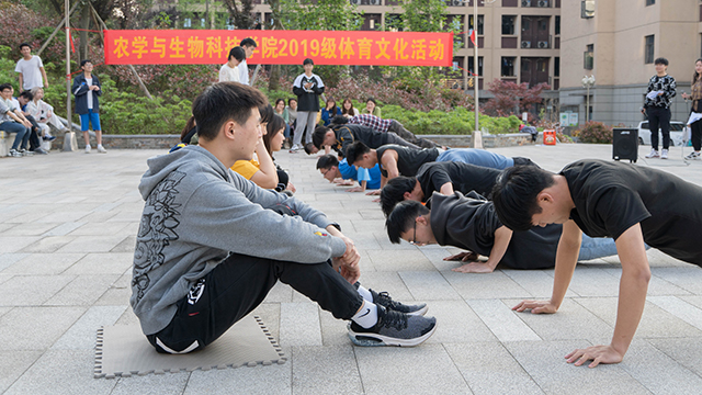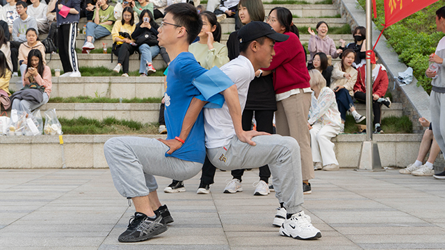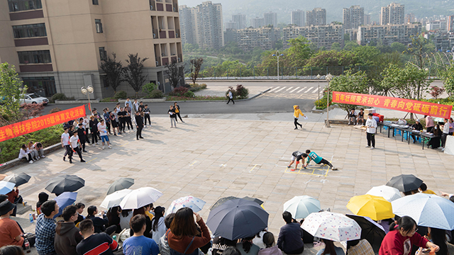 在团队项目结束后,还进行了女生平板支撑、男生俯卧撑与背靠背深蹲三项个人项目。学院素有“第二体院”的誉称,同学们更是卧虎藏龙,将比赛变成了个人能力秀,让在场师生观众惊叹不已,大加赞赏。这三个项目,不仅是个人素质的比拼,更是对毅力的考验,特别是平板支撑坚持到最后的两位女生,充分展示了永不放弃、永不气馁、永不低头的体育精神,就算牙齿紧咬、双腿颤抖,始终不愿意放弃,使比赛僵持了长达八分钟之久,让在场的所有人为她们紧张,也为她们喝彩。