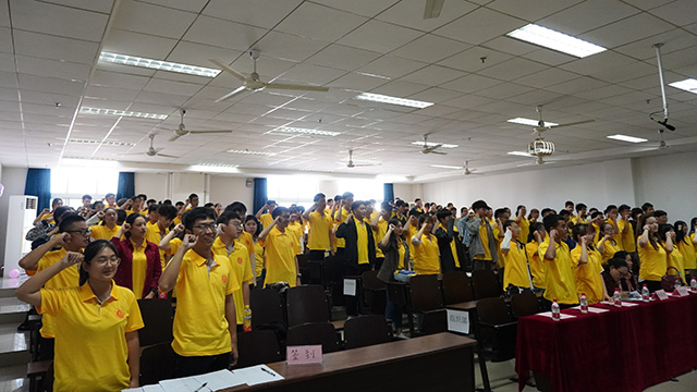 随后,办公室干事孙峻溟带领全体同学宣誓。“心系三农,顶天立地”的誓言整齐而雄浑,喊出了农生学子的自信,不同的声线汇聚,交织成在场每一个人的农生梦。