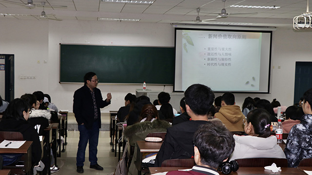 紧接着郑老师向我们介绍了新闻的要素和新闻价值取向原则。强调新闻观点比事实新闻重要,写新闻要眼界向下、感觉向内、境界向上。为方便同学们更好的理解,郑老师以几个触动人心的新闻为案例来讲解,其中令人印象最深刻的是河北农大的故事——一个永远的约定,现场同学都被深深感动。最后郑老师强调要培养新闻策划的意识,新闻策划是新闻撰写中尤其重要的一点,它要求新闻撰写人具有新闻意识和新闻眼光去寻找事件中的重点、特点、亮点、新点。