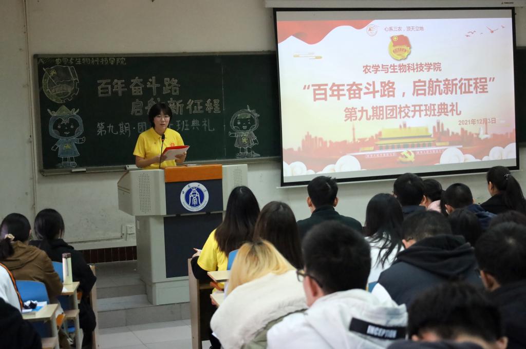 为贯彻落实习近平总书记“七一”重要讲话精神,深入学习党的十九届六中全会精神,从百年党史中汲取智慧和力量,为开启社会主义现代化建设开启新征程培养一批对党忠诚、信仰坚定、素质优良、作风过硬的团学青年骨干,农学与生物科技委员团委举办以“百年奋斗路,启航新征程”为主题的第九期团校培训班。2021年12月3日下午2:30,团校培训班于32教313教室举行开班典礼及第一次理论讲座。校团委副书记张瑜老师、学院党委副书记郑莉佳老师、学院团委书记许莹竹老师出席开班典礼,来自学院团委、学生会、各社团组织、各班团支部的团学骨干构成的160名学员共同参与,典礼由学院团委副书记胡芝雪主持。