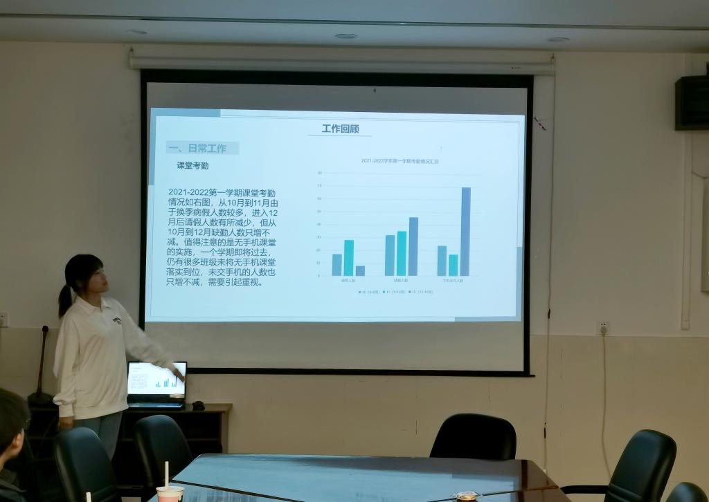 首先,各部门负责人围绕思想引领、成才服务、权益维护、自身建设、对外宣传等方面,依次进行工作述职。述职汇报以PPT展示和演讲的形式进行,既有对工作特色亮点的展示,也有对工作不足深刻总结和下一步工作打算的谋划。体育部在本学期完成了新生运动会、羽毛球联赛、“太阳杯”排球联赛以及“新生杯”篮球联赛中负责选拔、训练等重要工作。学科部在课堂考勤、辩论赛举行、学术论文大赛、笔记评选大赛、“学霸说”栏目建设等工作中取得了一定成效。宣传部负责学生会官Q和公众号的运营以及各活动的宣传,对新闻报道时效性不足等问题进行了反思。组织部在本学期完成了团组织关系转接、“青年大学习”的督促、各团支部“每周一学”活动开展和第九期团校培训班的举办等工作。就业创业部举办了简历大赛和完成了各大创新创业赛事的组织动员工作。办公室在物资管理、财务报账、内部枢纽、对外联络方面为各项活动开展提供了后勤保障。文娱部牵头完成了“植沐风雨 盛世芳华”2021年御姐av