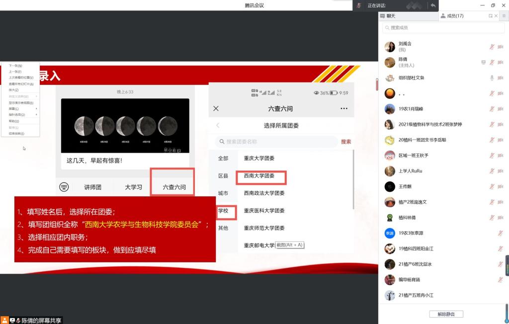 为严格遵守疫情防控要求,本次会议采用线上线下相结合的方式开展。会议中,由团委副书记胡芝雪带领各位团干部共同学习了团市委发布的《关于开展团干部“六查六问”专项行动 进一步改进作风狠抓落实的实施方案》的文件及相关学习资料。团委组织部的负责同学为大家讲解“六查六问”专项行动线上操作方式及注意事项。