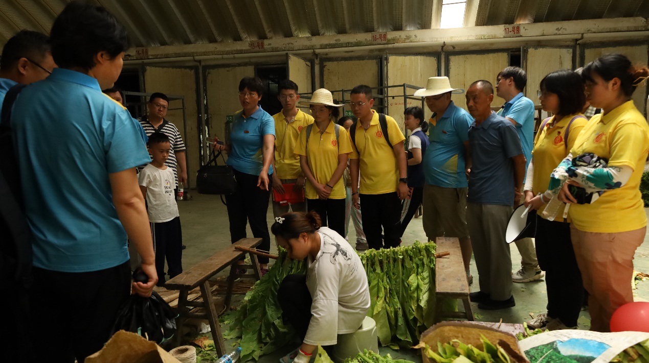 在烤烟工厂,队员们近距离观察烤烟的过程。烤烟分为三步,一是摘烟叶,将地里成熟的烟叶摘下,而一株烟草的成熟往往会持续很长时间,一次可能只成熟两至三片叶片,这就需要烟农经常去地里采摘,并将其打捆做好保护;第二步是扎烟叶,烟农们会将烟叶分为各个层次分开进行烤制,以两至三片叶片为一结,依次扎在木架上;第三步就是上架,开始烘烤,其中也要注意定色,以保证烟叶蕴含的酶类能持续活动并产生生化反应。与以往烧煤炭的生产方式不同,彭水县润溪乡以绿色发展为本,采用了新能源为工厂烤烟设备提供动力。同时,机械化的普及也极大程度提高生产效率,减轻了农民的负担。