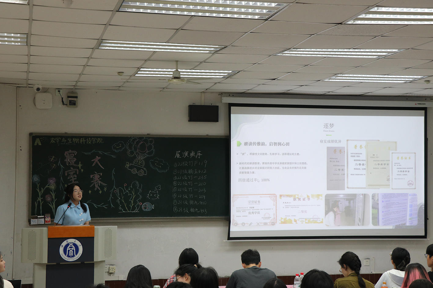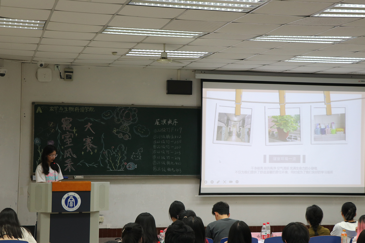 决赛现场,参赛寝室代表就寝室成员、环境卫生、精神风貌、学风建设、荣誉奖励等方面依次进行PPT和VLOG展示。在公平、公正、公开的原则基础上,经评委打分,楠五412、竹F119、楠九410、楠九413获三等奖;竹一235、竹一204、竹一210获二等奖;竹一203荣获一等奖。