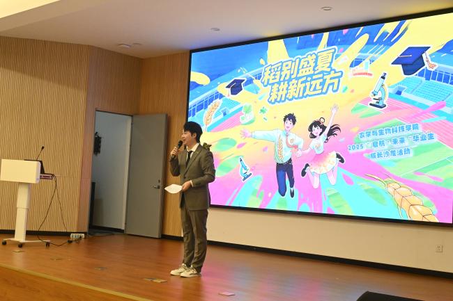 主持人热情洋溢的欢迎辞为简短而温馨的活动拉开序幕。2021级辅导员高荣蓉老师深情寄语毕业生,回顾大学时光的成长点滴,并送上真挚的毕业祝福与嘱托。高老师特别寄语毕业生“三个希望”,希望大家成为向上的人,勇于在社会繁杂的声音中坚定自我,保持积极向上的心态;希望大家成为努力的人,坚信努力是有意义的,保持在学校里的这一份努力走入工作和生活当中;希望大家成为幸福的人,珍惜人生中的每一刻,努力定义属于自己的“幸福”。高老师的寄语为同学们注入前行的力量,激励大家带着“农生人”的担当与梦想启航未来。