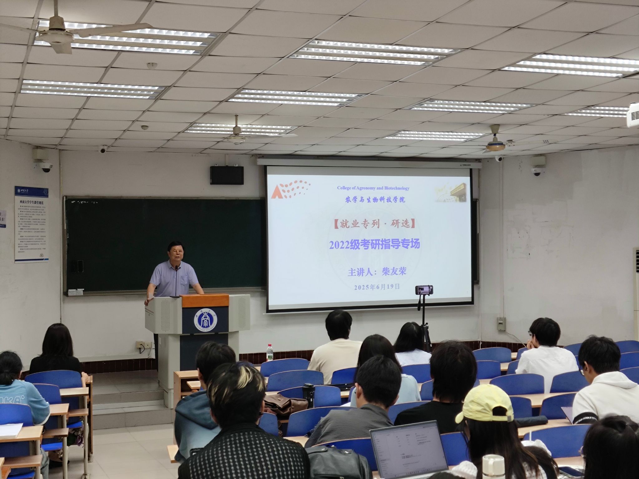于2025年6月20日举办面向2022级本科生的【就业专列·研选】考研指导专场讲座。本次讲座特邀博士生导师柴友荣教授主讲,聚焦考研目标院校的科学选择以及初试、复试、调剂全流程备考策略,旨在帮助学生精准锚定研途坐标,避免常见误区,提升备考效率。
