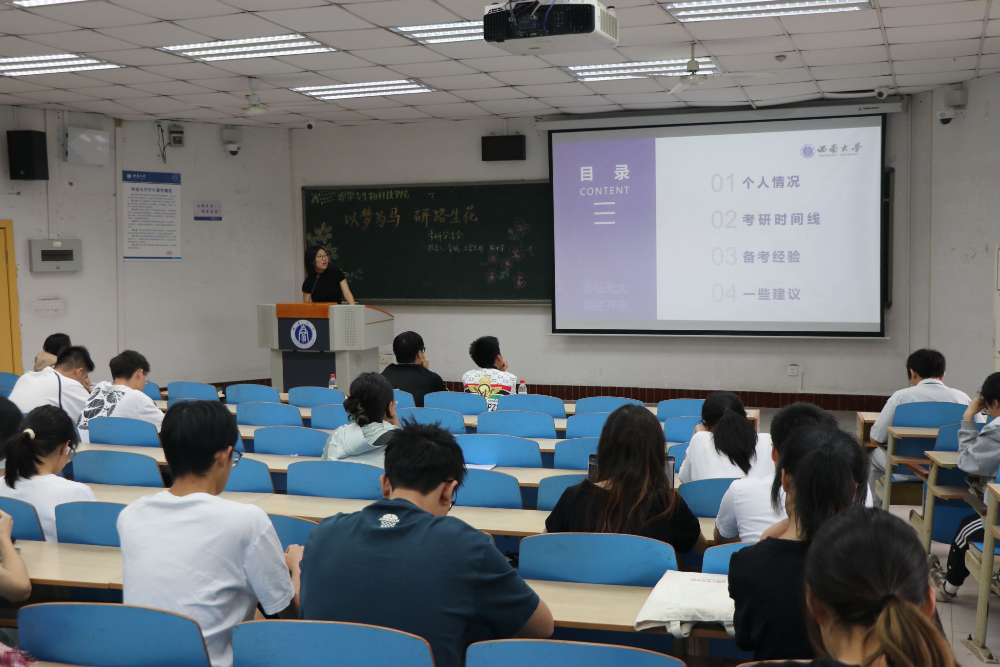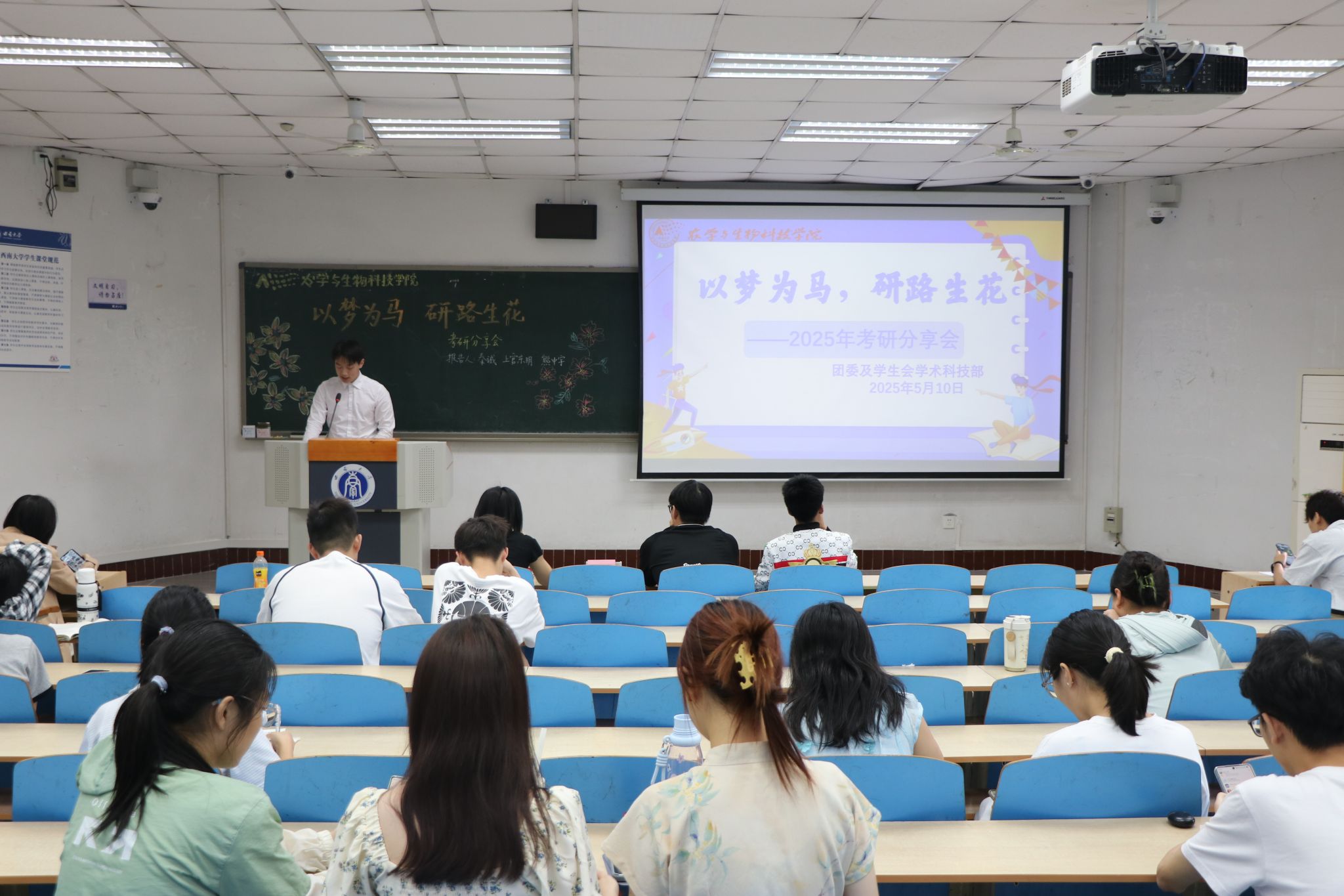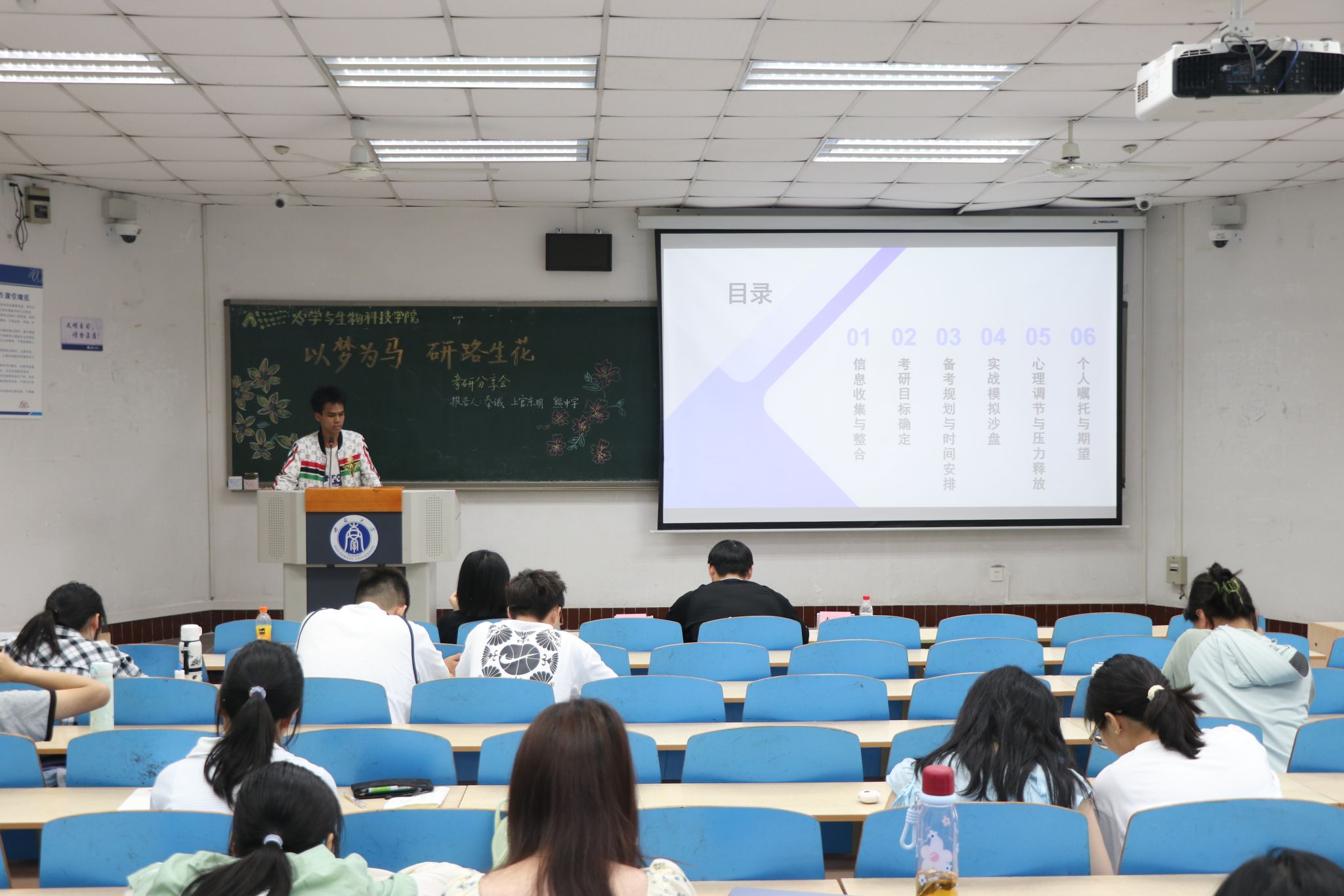 在32教312教室成功举办“以梦为马,研路生花”考研经验分享会。2021级秦诚、上官东明、熊中宇三位优秀学子化身“研路引航员”,围绕目标定位、备考策略、心态管理等内容展开深度分享,并为低年级同学们答疑解惑。