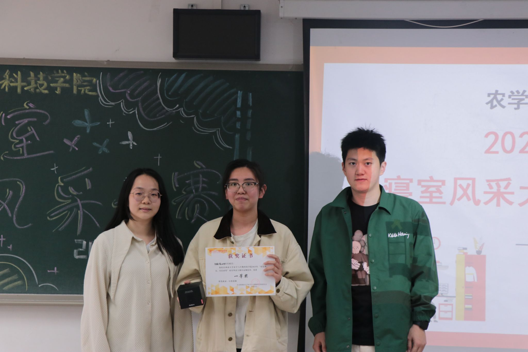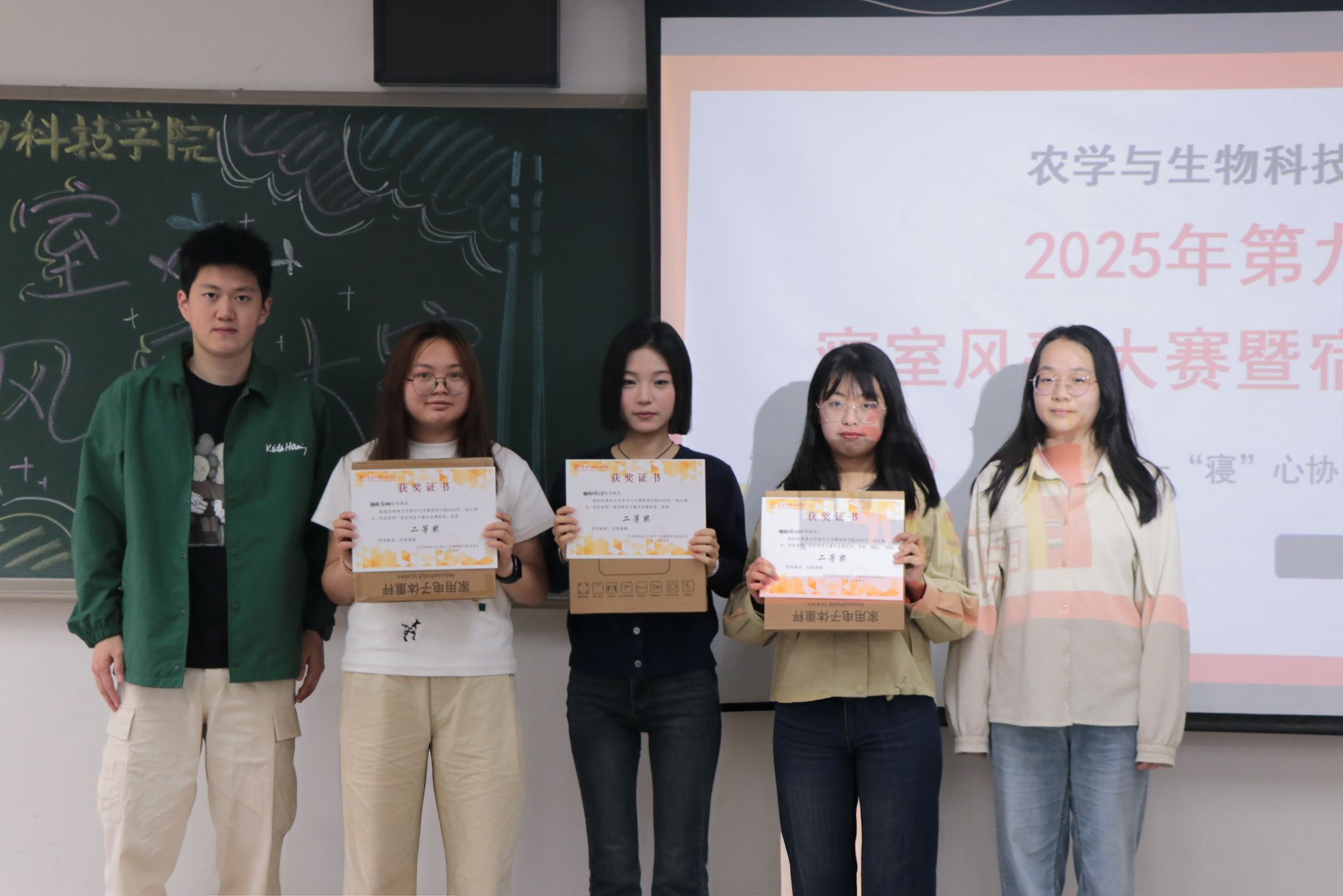 第十九届团委及学生会主席郭少宇同学和第二十届团委及学生会主席王瑞莹同学为获奖寝室颁发奖状和奖品,并合影留念。