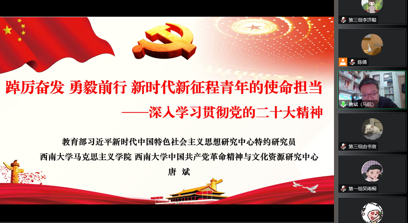 在青春昂扬的团歌声中,第十期团校培训班开班典礼圆满结束。随后进行团校培训班第一讲,由马克思主义学院副教授唐斌老师为学员们带来“踔厉奋发,勇毅前行,新时代新征程青年的使命担当——深入学习贯彻党的二十大精神”理论讲座。唐斌老师为学员们系统解读了二十大报告,结合御姐av