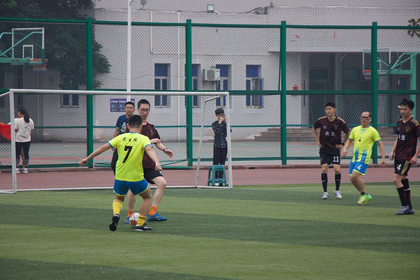 经过赛前的充分热身,比赛正式开始,双方球员迅速进入状态,展现出了高超的球技和精神面貌。教师队在比赛中控制着节奏,不断向毕业生队抛出威胁球,让对手防守心理始终处于高度紧张状态。而毕业生队虽然一直被教师队领先,但依然没有放弃,反而加强进攻,试图扳回比分。他们采取多种技术手段,在场上互相配合,一次次打出好机会,并多次将球打入了教师队禁区。