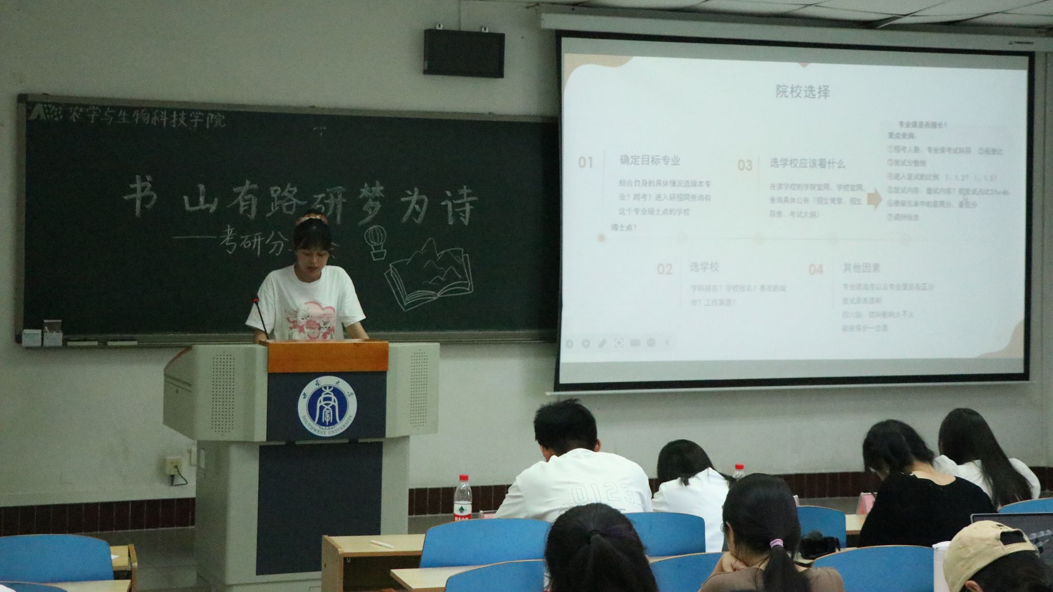 农业管理专业的谭诗雨同学主要从选择学校和专业时应注意的问题以及获取信息的途径两方面进行分享。关于择校,她建议同学们浏览意向院校的官网,仔细分析目标专业的招生人数、复试形式等关键信息。她还提出可以通过“农业硕士考研帮”公众号获取农业方面的院校信息,通过“考研斯基师兄”公众号获取政治、英语等学科的历年资料。最后,她谈到备考心态也很重要,备前勿浮躁、备中不烦躁、中后要坚定、考前要放心。