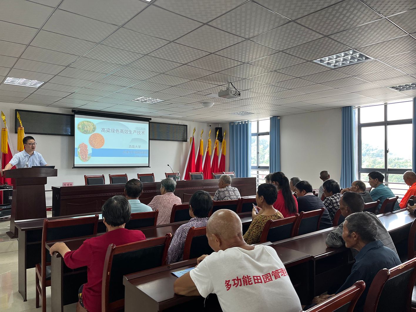 黄庄村作为重庆市江津区现代化农业园区核心示范片区,是一个以传统种植养殖业为主的农业村。近年来,该村探索形成的“油菜+高粱”轮作种植模式,不仅提高了土地的利用率,还可以促进农民增收、生产增效和生态增值。来自实践团的油菜领域专家徐新福老师和高粱领域专家肖前林老师,以其丰富理论知识和实践经验,为农户们带来了一场深入浅出的种植技术讲座。首先,肖前林老师从高粱生产的重要性、高粱的生物学基础、高粱绿色高产栽培技术、高粱生产存在的问题和高粱质量等级区分等五个方面向农户们介绍了高粱种植的关键技术,详细解析了高粱在生长过程中需要注意的事项,并分享了提高高粱产量和品质的实用技巧。随后,徐新福老师针对前一天座谈会中提到的问题详细讲解了油菜宜机化种植的技术要点和品种选择。他强调,实现油菜生产种、管、收的全程机械化的关键在于品种的选择和收获时期的把握。此外,他表示,油菜的科学种植不仅能提高产量,还能改善土壤肥力,减少病虫害的发生。