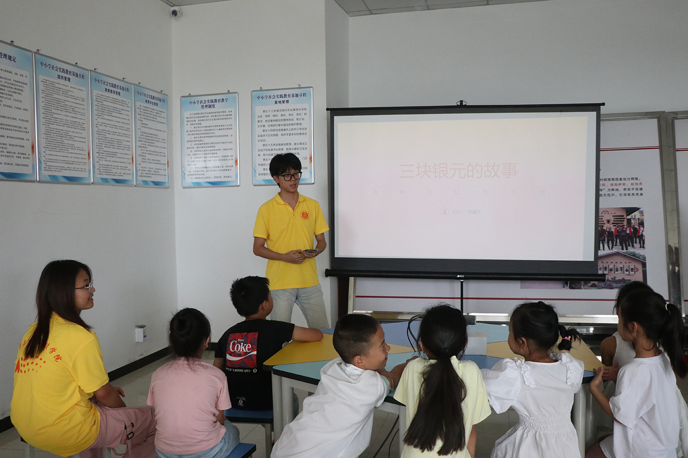 “小朋友们,你们知道杂交水稻之父是谁吗?”“是袁爷爷!”实践团成员欧嘉乐同学向当地小朋友们讲述了“杂交水稻之父”袁隆平的事迹与三个银元的故事,让小朋友们深刻感受到革命先烈大公无私的革命精神和袁隆平院士一辈子躬耕田野、团结协作、勇攀高峰的科学家精神。支教小课堂为当地小朋友赋予了深刻的思想启迪和精神滋养,不仅让小朋友们学习到了宝贵的历史知识,更在他们心中播下了爱国主义的种子。