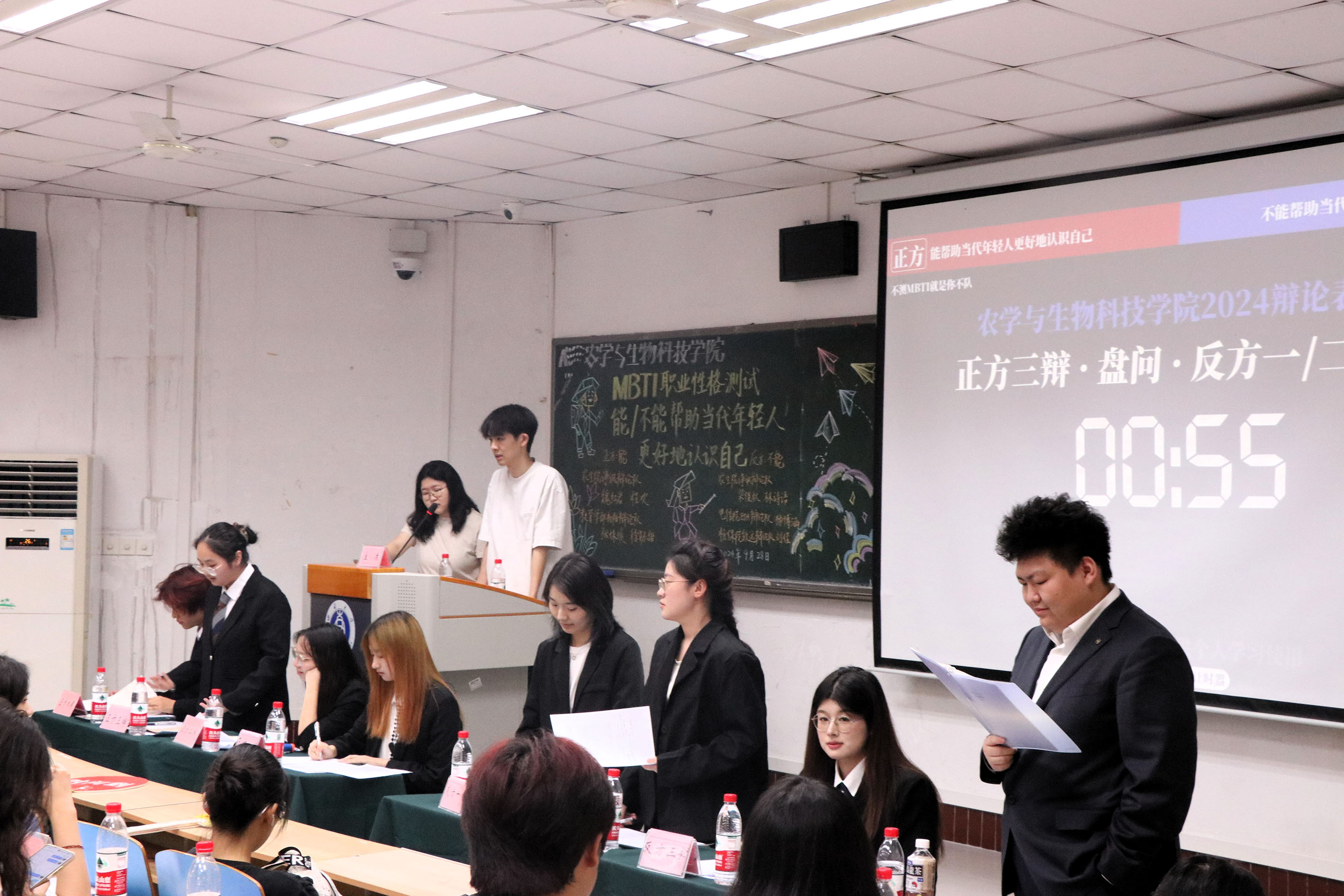 诤讽辩论队、教育学部初阳辩论队、电信院EDA辩论队、植保院致远辩论队于2024年9月28日(星期六)下午14:20在32教313教室联合举办了一场以”MBTI职业性格测试能不能帮助当代年轻人更好地认识自己”为辩题的2024级新生辩论表演赛。