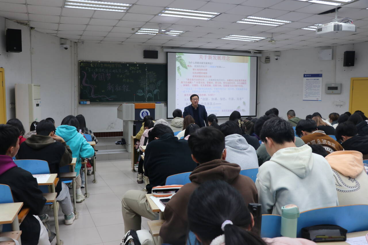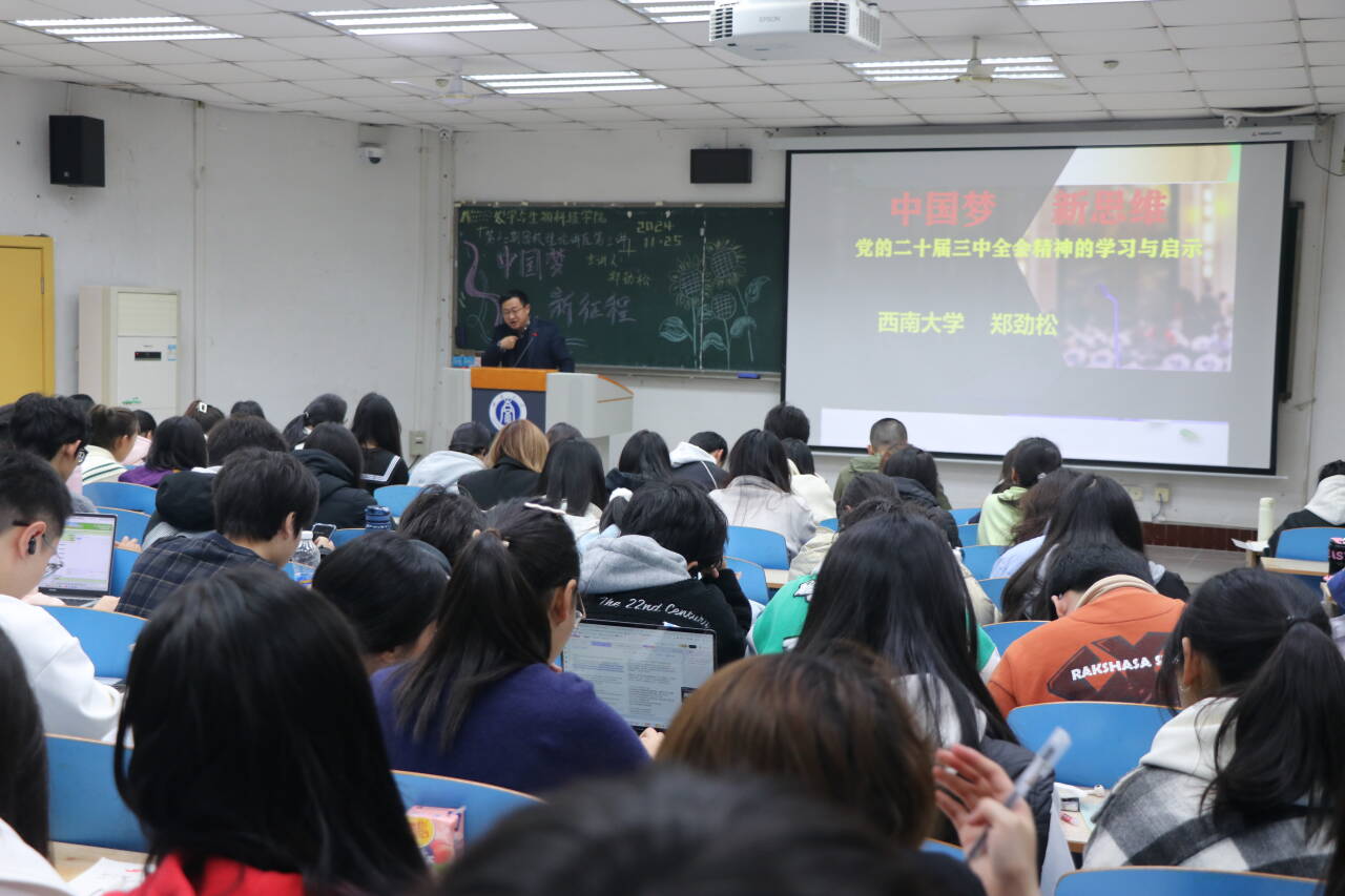 讲座伊始,郑劲松老师提出“时代与人生”这一话题,以高考作文以及自身成长的例子告诉学员们要深刻把握世界发展大势、历史演进趋势、时代变化态势、中国自身优势等时代之势。郑老师结合自己的成长历程和多年的工作经验,特别强调了挖掘个人优势的重要性。接着,郑老师引用了习近平总书记在中共第十八次全国代表大会上提出的“实现中华民族伟大复兴,是中华民族近代以来最伟大的梦想”,向学员们阐释了中国梦的深层含义以及实现这一梦想的路径,同时阐述了新时代的“新”体现在哪些方面。实现中国梦必须走中国特色社会主义道路,必须坚持中国特色社会主义理论体系,必须弘扬以爱国主义为核心的民族精神和以改革创新为核心的时代精神,必须凝聚中国各族人民大团结的力量。新时代的“新”主要体现在新的发展阶段、新的发展理念以及新的发展格局上。郑老师强调,我国目前正经历“三期叠加”的关键时期,这包括增长速度的换挡期、结构调整的阵痛期以及前期刺激政策的消化期。在这样的背景下,我们更应该持续坚持新发展理念。党的二十届三中全会强调了进一步全面深化改革和推进中国式现代化的重要性。在此背景下,郑老师向学员们深入阐释了中国式现代化的核心特征和根本要求,并且针对学院专业特色,着重阐述了农业现代化的关键性。最后,郑老师以习近平总书记所言“山再高,向上攀,总能登顶;路再长,走下去,定能到达!”作为结语,希望学员们秉持“穷山距海,无远弗届”的精神,为实现中国梦而不懈奋斗。