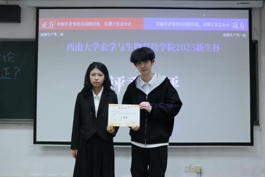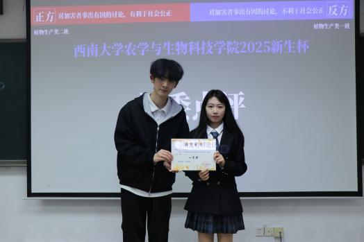 最终,2025级植物生产类1班以8:7的比分险胜,荣获本次新生辩论赛冠军,2025级植物生产类2班获二等奖,2025级植物科学与技术2班获三等奖,2025级生物育种科学2班获优秀奖。