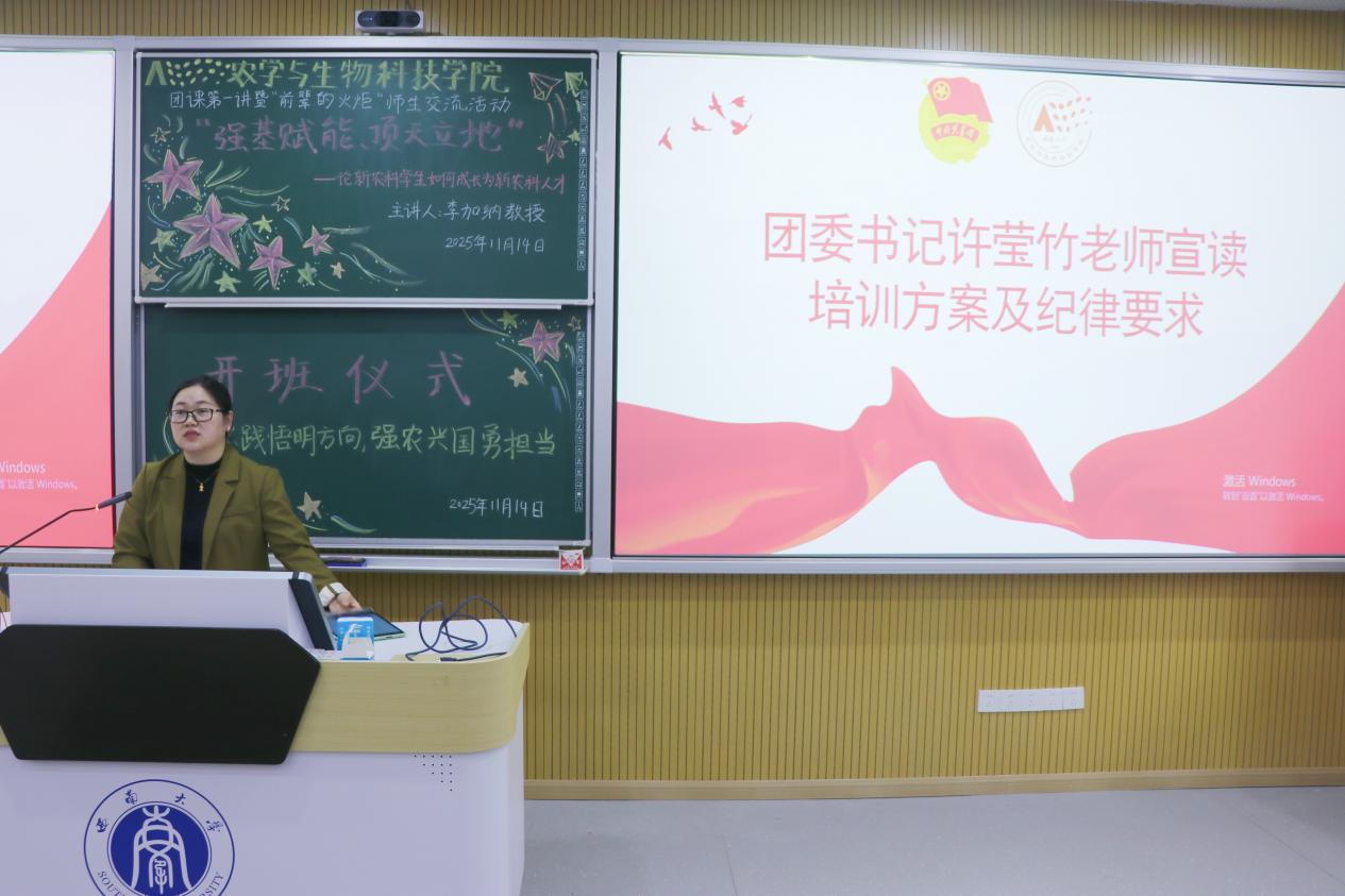 随后,学员代表李静雯同学发言,她将本次团校比作学习党团理论的“思想加油站”与锤炼本领、增长本领的“实践练兵场”,结合习近平总书记“乡村全面振兴,人才先行”的重要论述,她发出青春倡议:全体学员将以此次培训为契机,以饱满的热情、扎实的学风严守纪律、勤思笃行,把理论知识转化为服务乡村振兴的实际行动,让青春在广袤田野上绽放光彩。